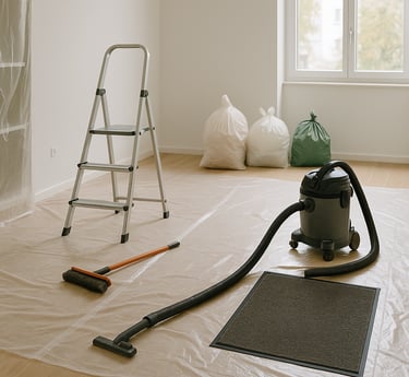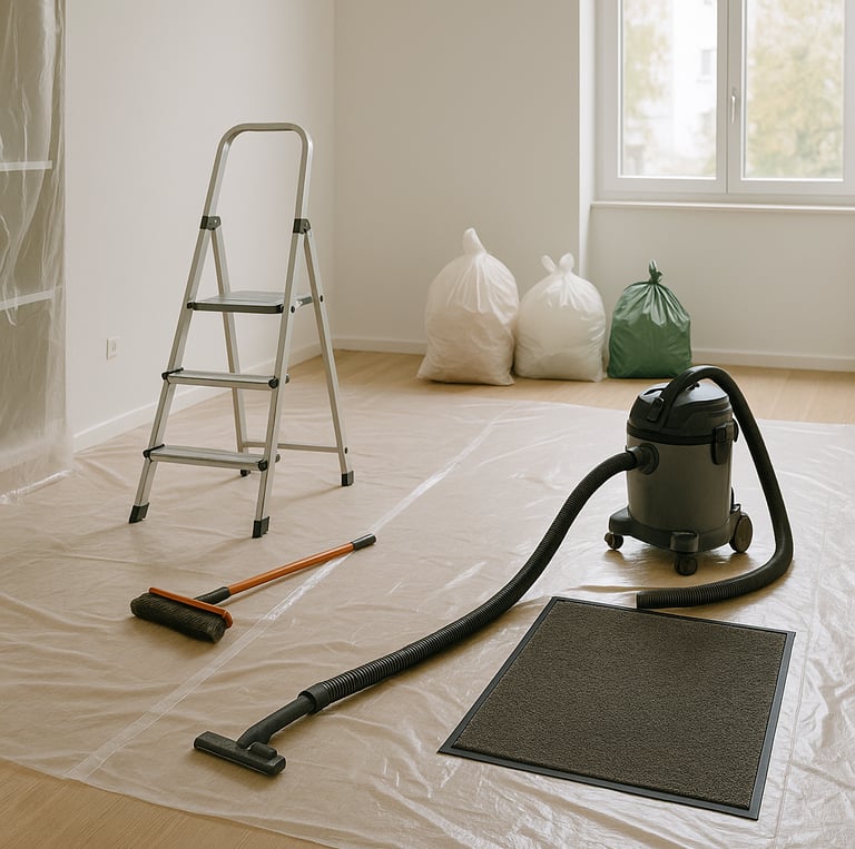 Mise en place systématique de bâches, films de protection et tapis d’entrée pour préserver sols, plinthes, sanitaires et menuiseries dès le premier jour.Gestion des déchets